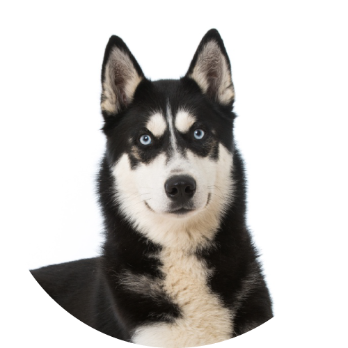 オオカミに似た凛々しい顔立ちが最大の特徴です。V字型の頭部にピンとした三角形の立ち耳、アーモンド型のつり上がった瞳を持ちます。瞳の色はブルーやブラウンのほか、左右の色が異なるオッドアイの個体もいます。顔にある歌舞伎のくまどりのようなマーキング模様は、他の犬種では見られないハスキーならではの特徴です。被毛は分厚いダブルコートで、毛色はブラック&ホワイト、グレー&ホワイト、ブラウン&ホワイトなどさまざまなバリエーションがあります。